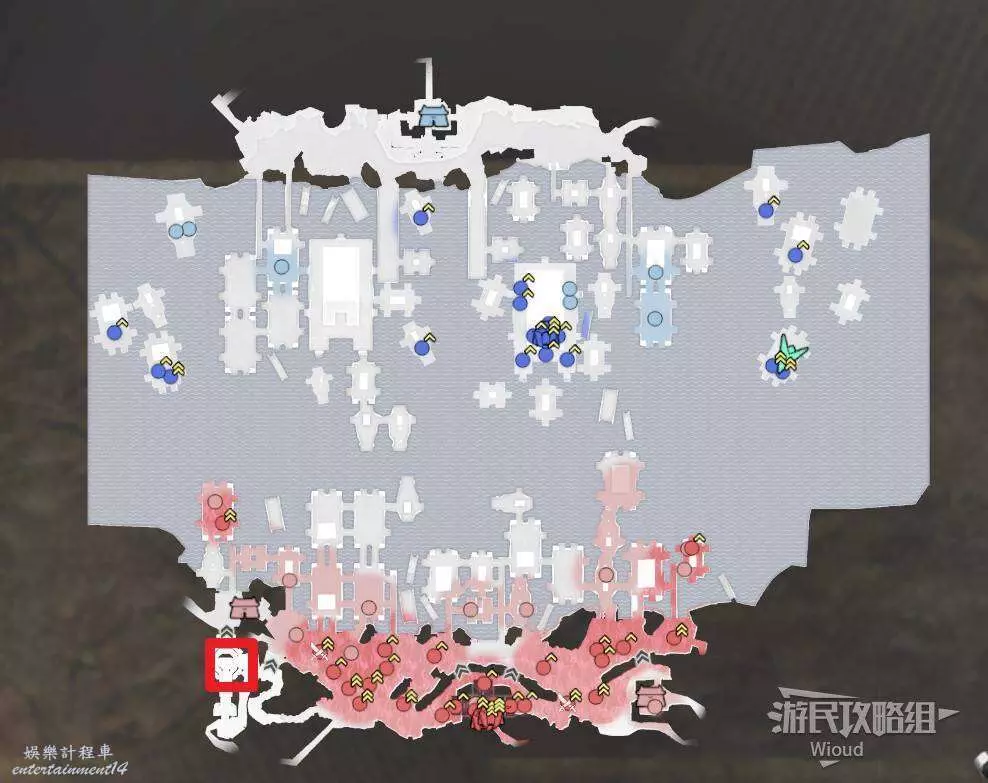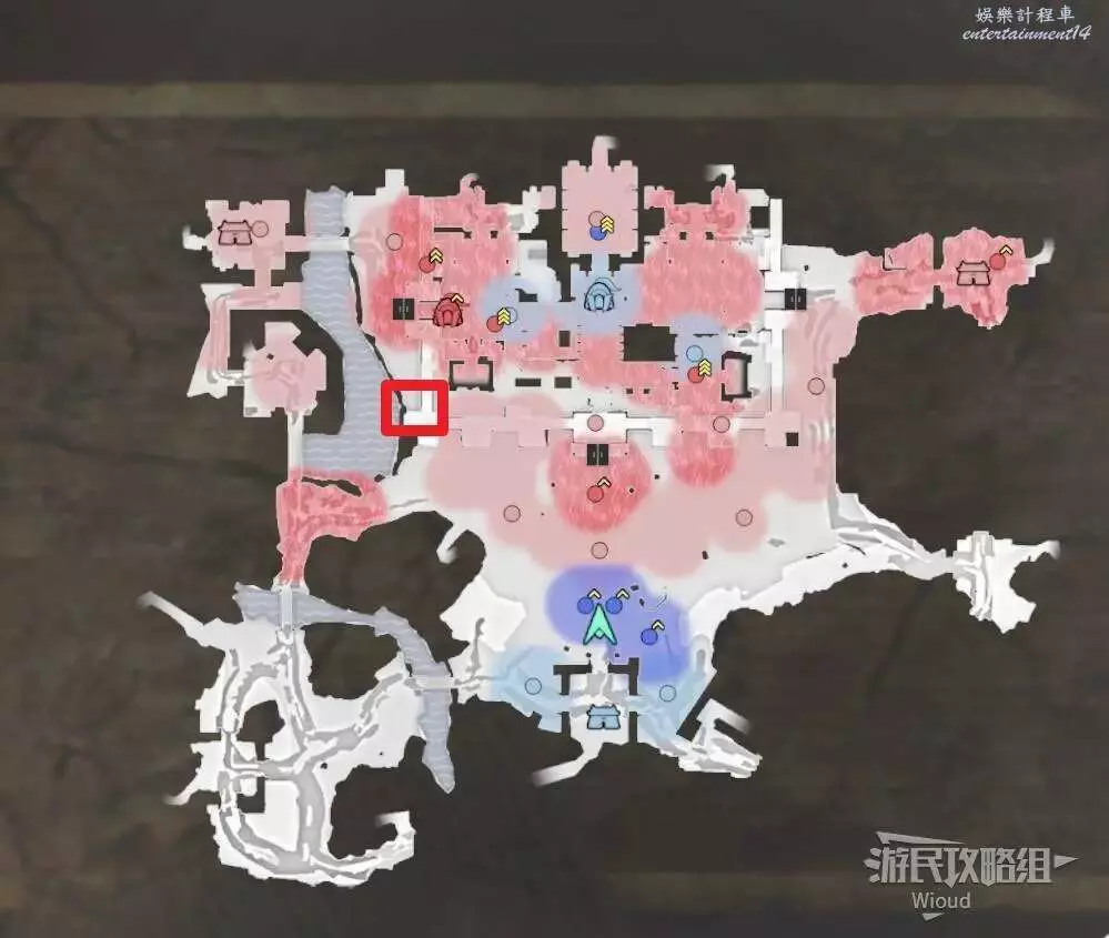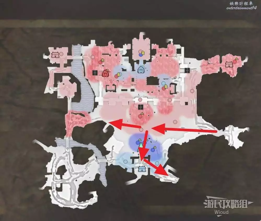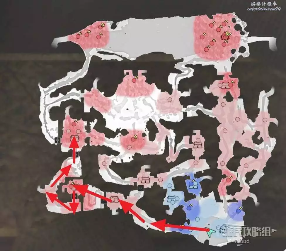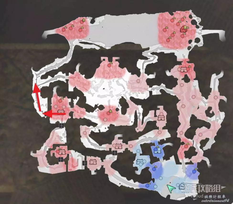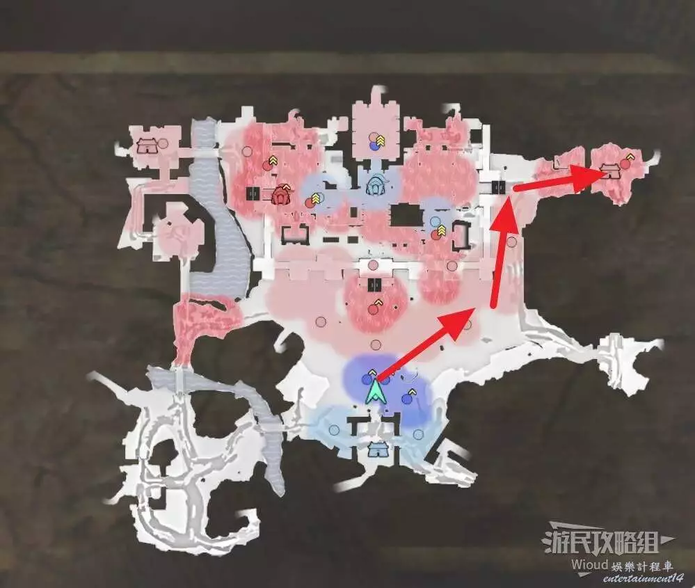 此戰開啟後我們直接沿著下圖所示路線從左邊移動到箭頭停止處的據點內。