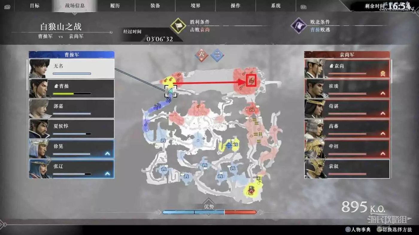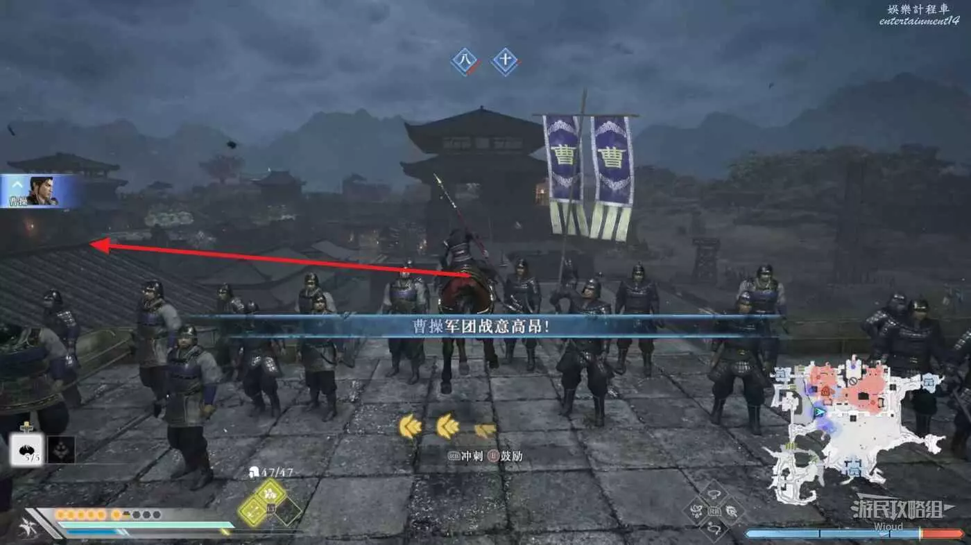 開局先往地圖右上角的據點移動,此據點的敵人到達時間會直接向曹操射箭,這裡如果在時間到達之前將據點佔領將直接跳過這一步驟。