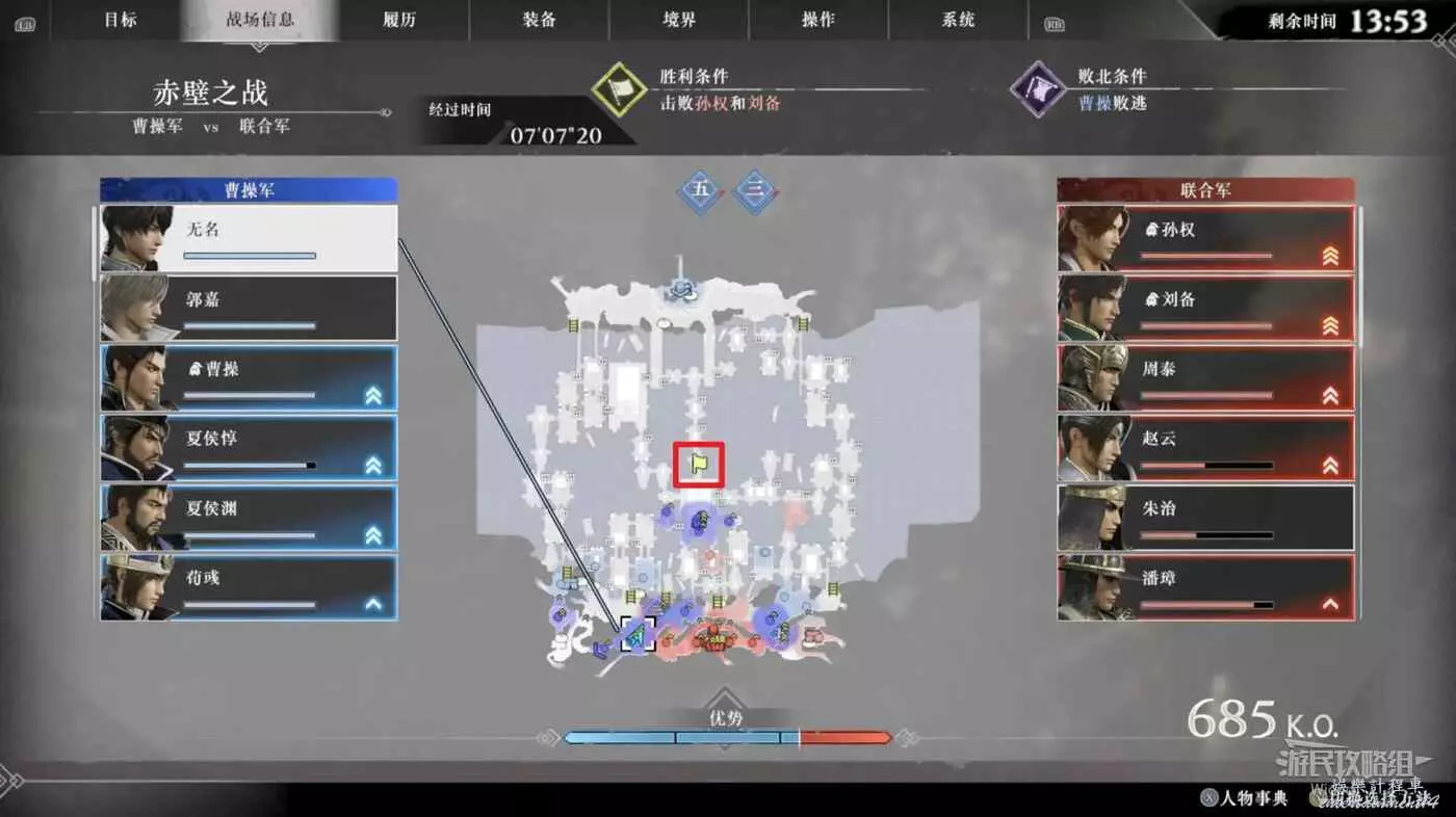 此戰開局會將我們刷在地圖右側,先上岸擊敗周圍的敵軍,注意左邊武將們說的話。