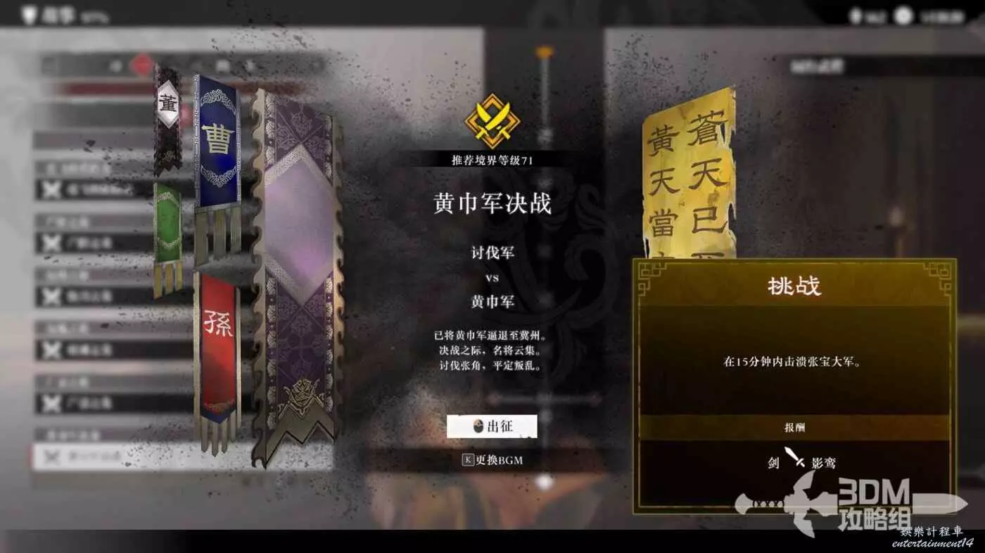 完成“勇戰無雙之人”難度下的【黃巾軍決戰】,並且完成【在15分鐘內擊潰張寶大軍】。