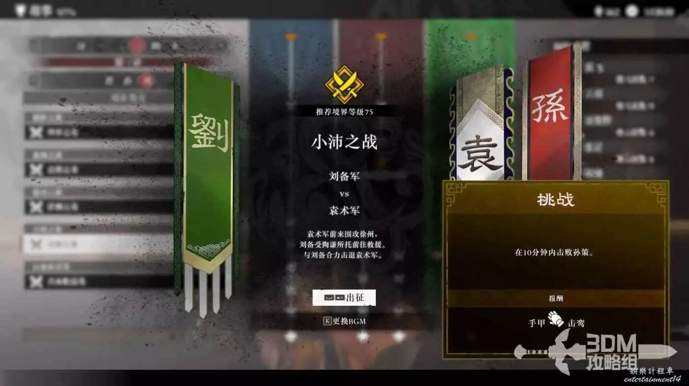 完成“勇戰無雙之人”難度下的【小沛之戰】,並且完成【在10分鐘內擊敗孫策】。