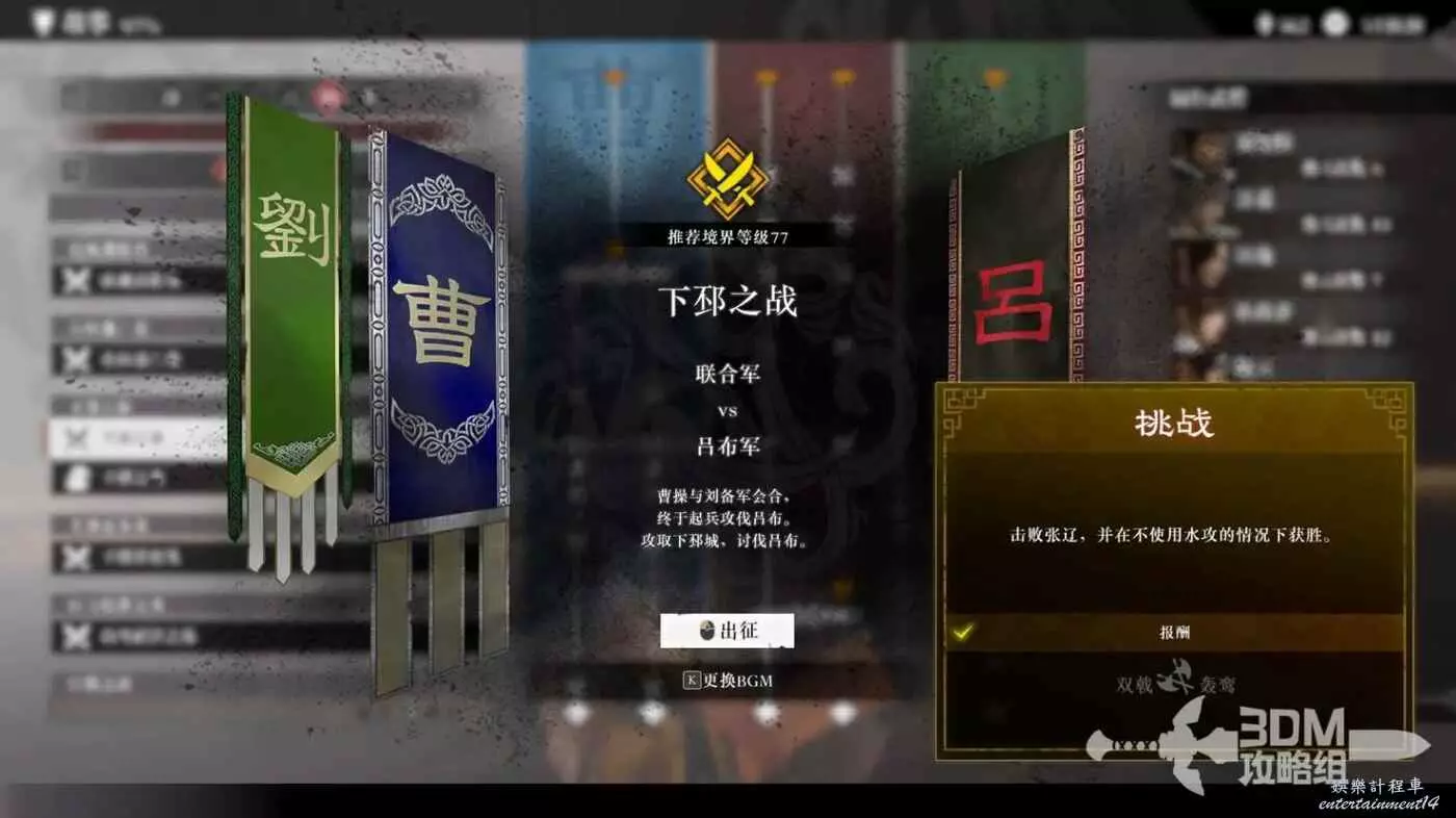 完成“勇戰無雙之人”難度下的【下邳之戰】,並且完成【擊敗張遼,並在不使用水攻的情況下獲勝】。