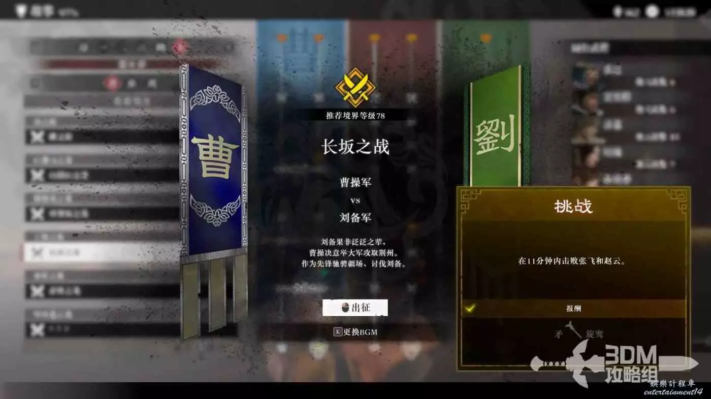 完成“勇戰無雙之人”難度下的【長阪之戰】,並且完成【在11分鐘內擊敗張飛和趙雲】。