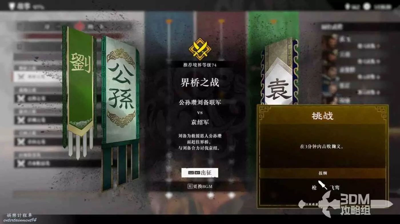 完成“勇戰無雙之人”難度下的【界橋之戰】,並且完成【在3分鐘內擊敗麴義】。