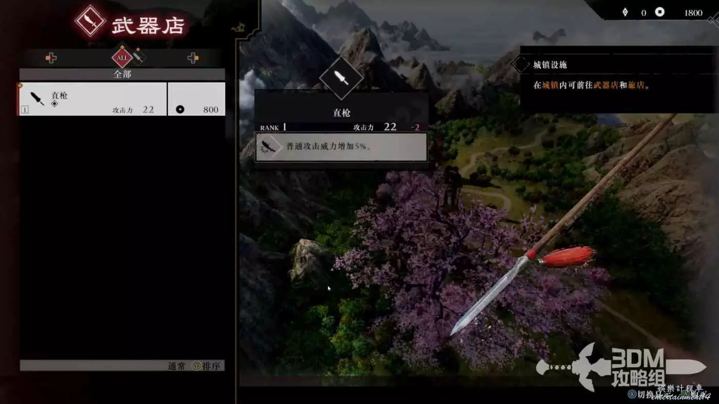 在大地圖我們會跟教學走在武器店購買新武器長槍,這個武器預設等級是1,現在使用可以快速升級提升境界。