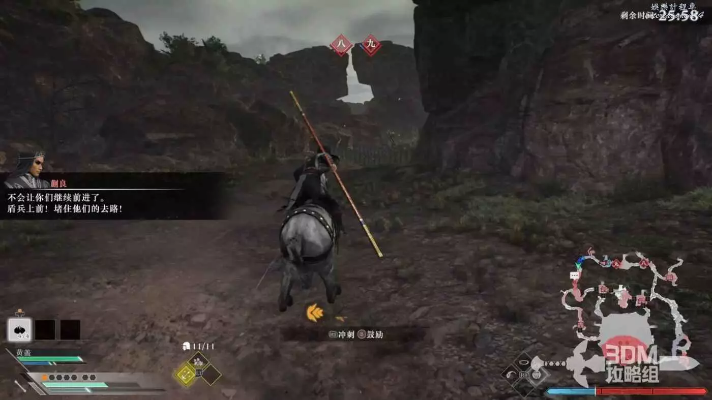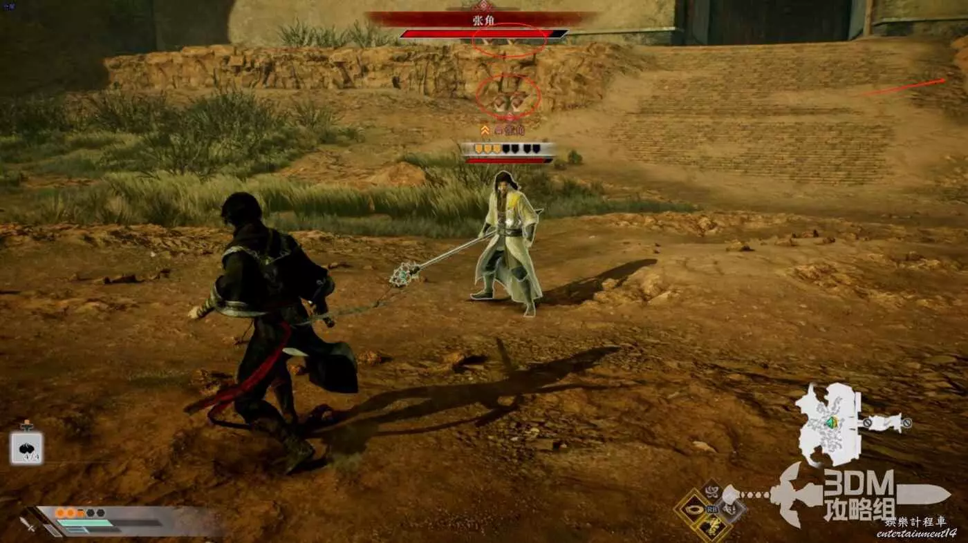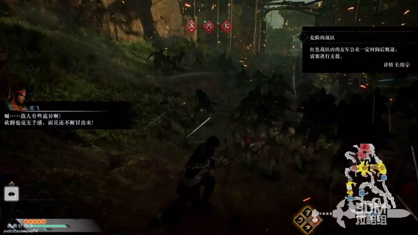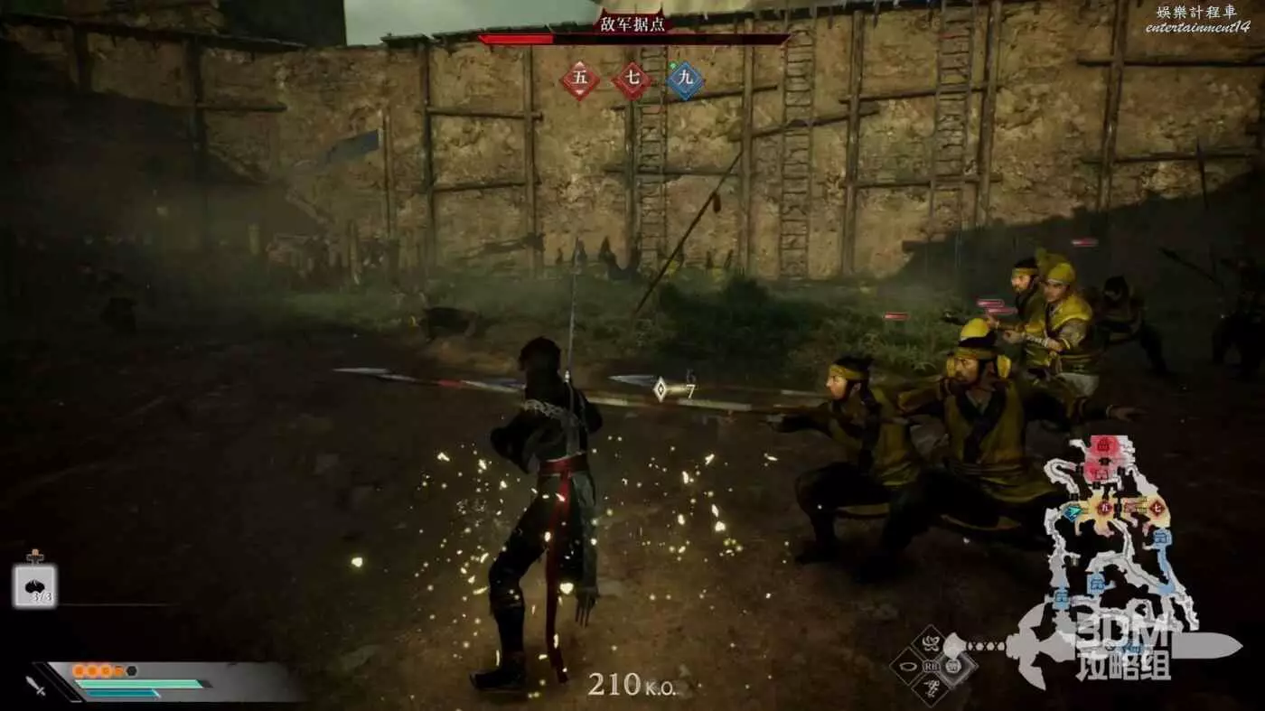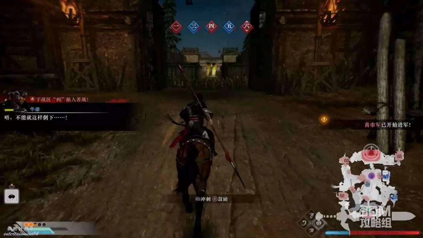此處會受到多個敵人將領的攻擊,要注意閃避/防禦。同時小兵有時會受到地方將領的指示,身上會冒出紅光,此時的攻擊無法被防禦,需要閃避或者使用帶有發勁的武藝才能抗衡。