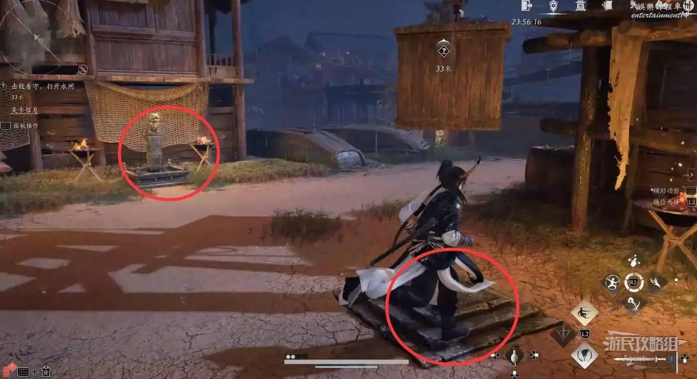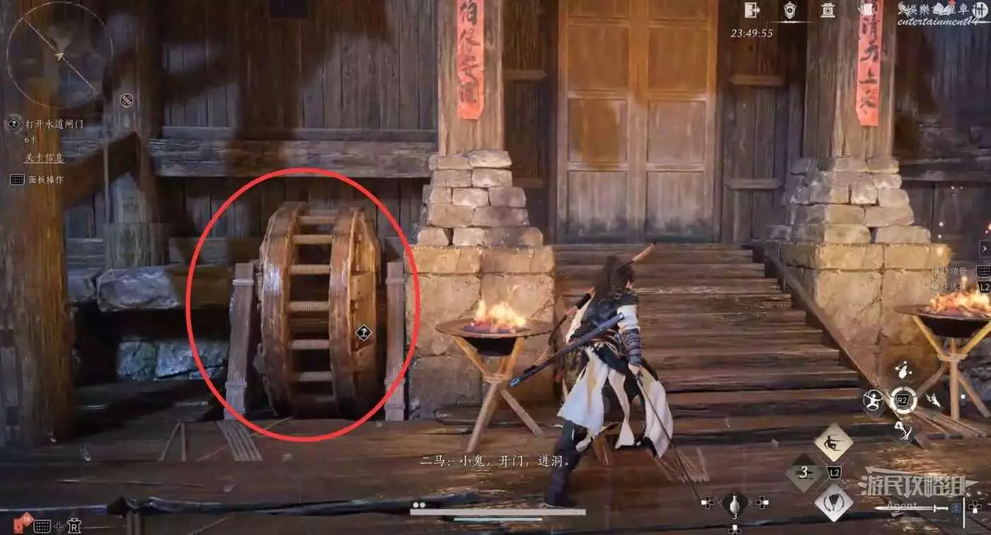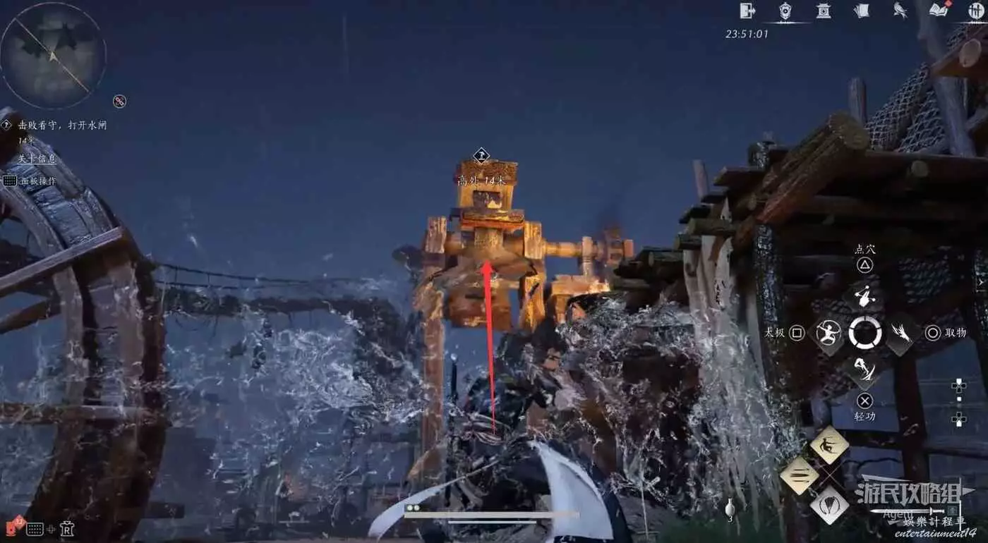 繼續乘船,再次上岸擊敗馮如之,操作門旁的轉輪打開水道閘門。