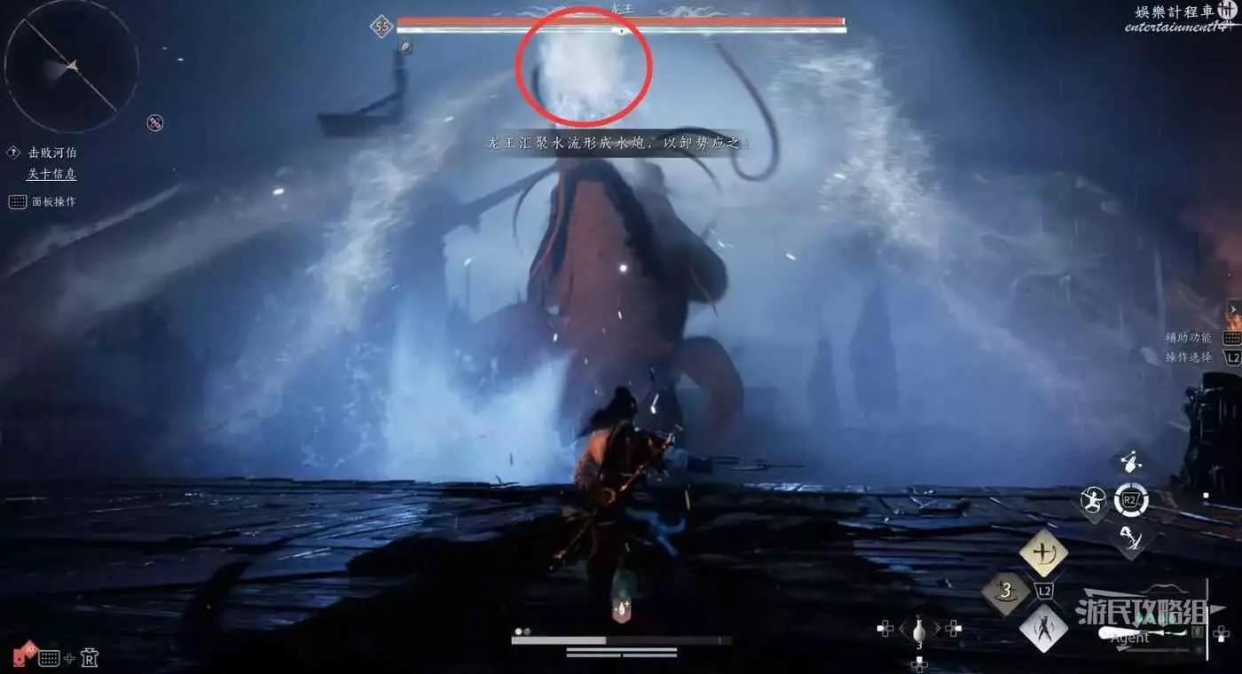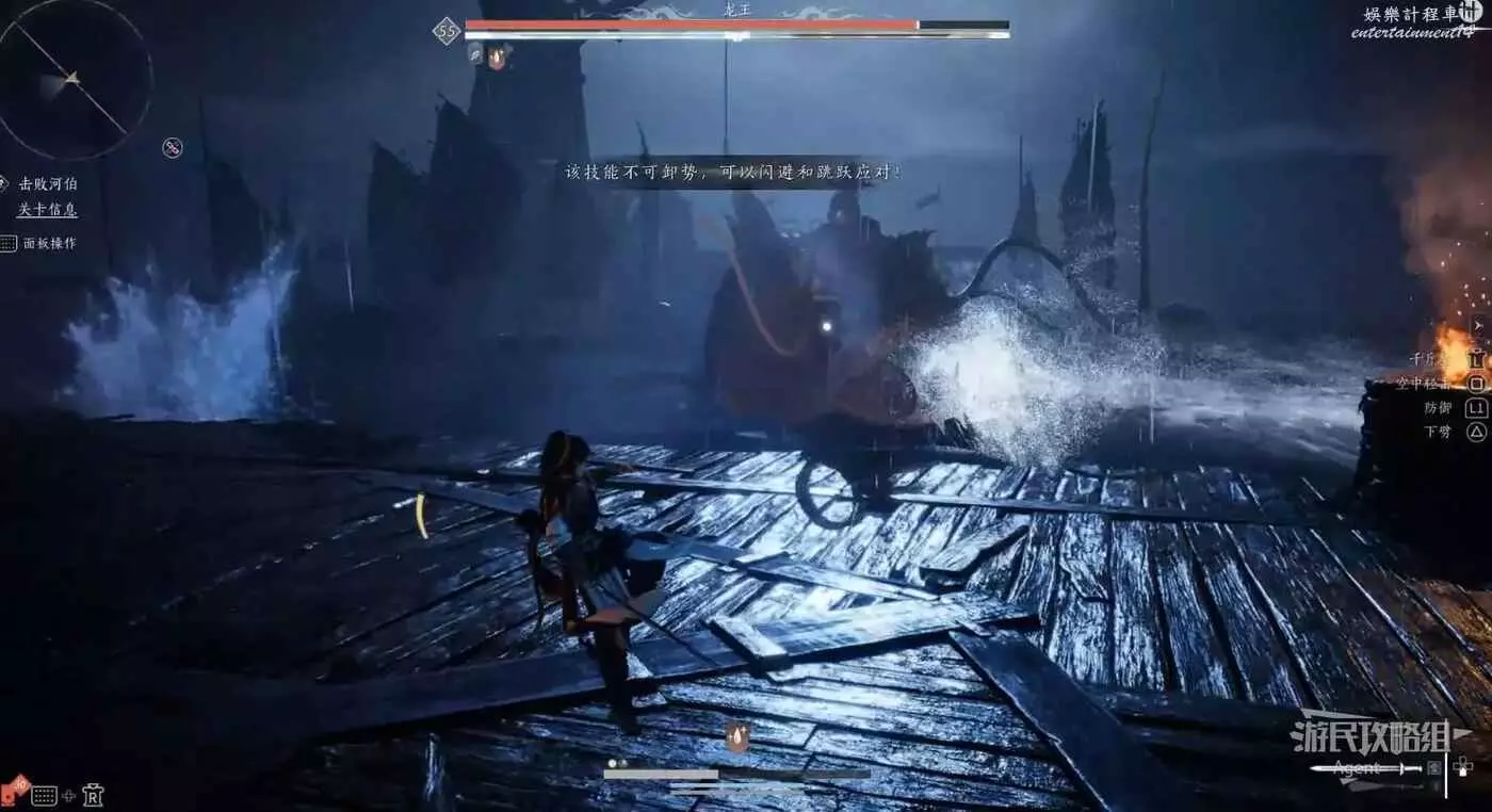 當河伯大喊“黃河之水天上來”時,會駕駛龍王騰空而起,然後下砸,應迅速往遠處躲,避免被砸到。