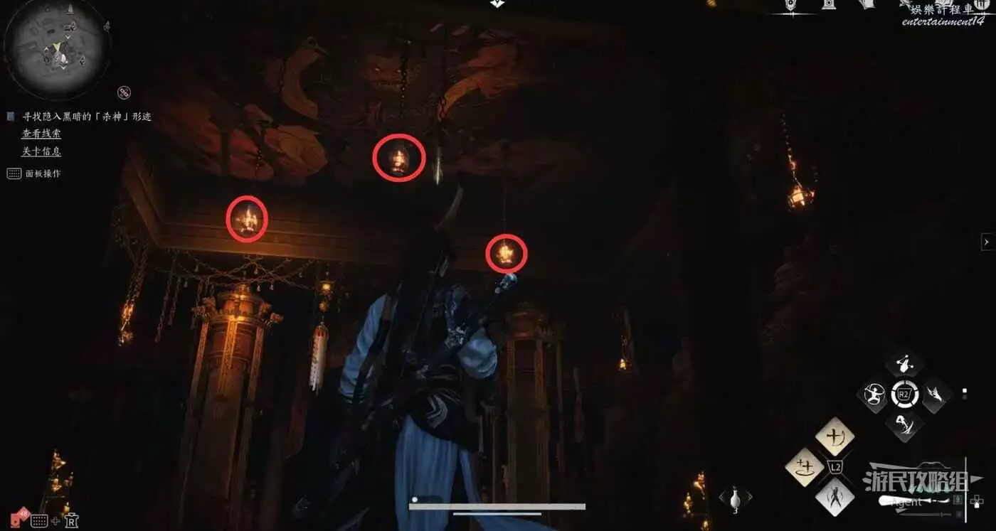 用火箭點亮天花板上的三個燈,看到殺神的畫像。