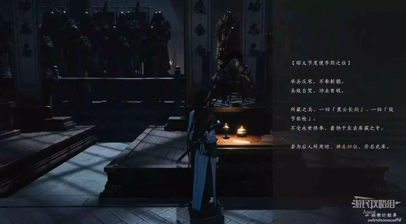 需要去找到黑雲長劍、效節銀槍這兩把李筠的武器,放到“昭義節度使李筠之位”的甲胄處,才能打開武庫。