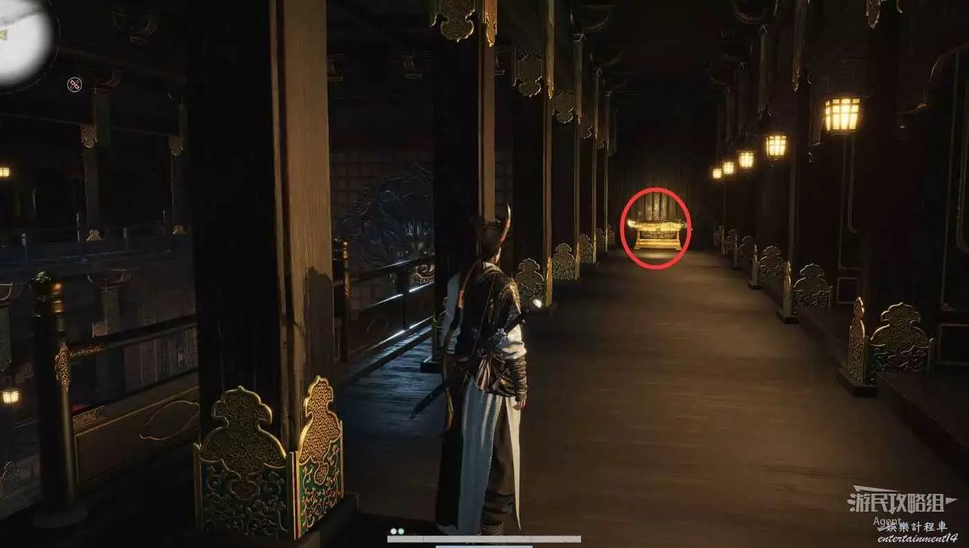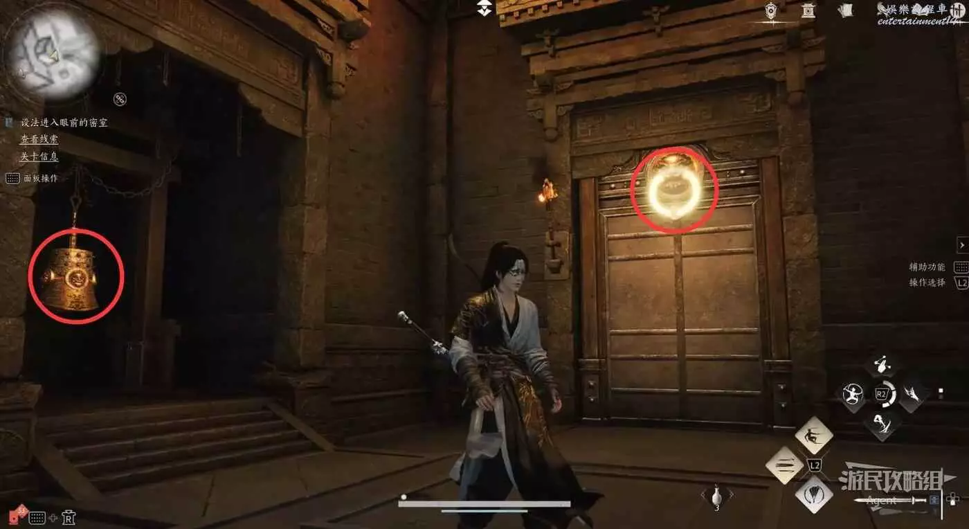 往裡走,敲鐘可使圓環亮起,再用點穴破壞圓環,門就開了,來到密詔室。