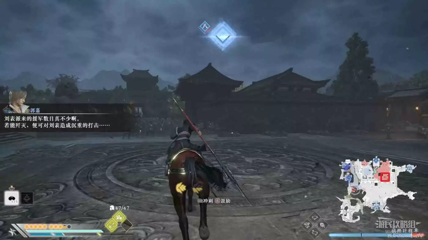 開局先往地圖右上角的據點移動,此據點的敵人到達時間會直接向曹操射箭,這裡如果在時間到達之前將據點佔領將直接跳過這一步驟。