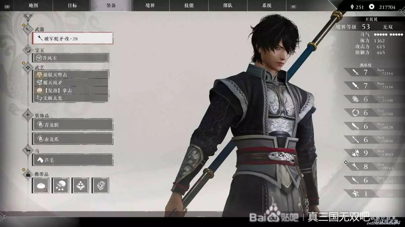 比較隨意,可以根據武將給的戰功任務來選武器,我主要用的槍,因為槍彈反後按【防禦+重攻擊】可以非常方便地挑飛,之後繼續重攻擊連段,最後接技能,配合【升風玉】(增加空中傷害的寶玉,對收刀也有加成),可以打出可觀傷害,兩次呂布就是用槍磨掉的。
