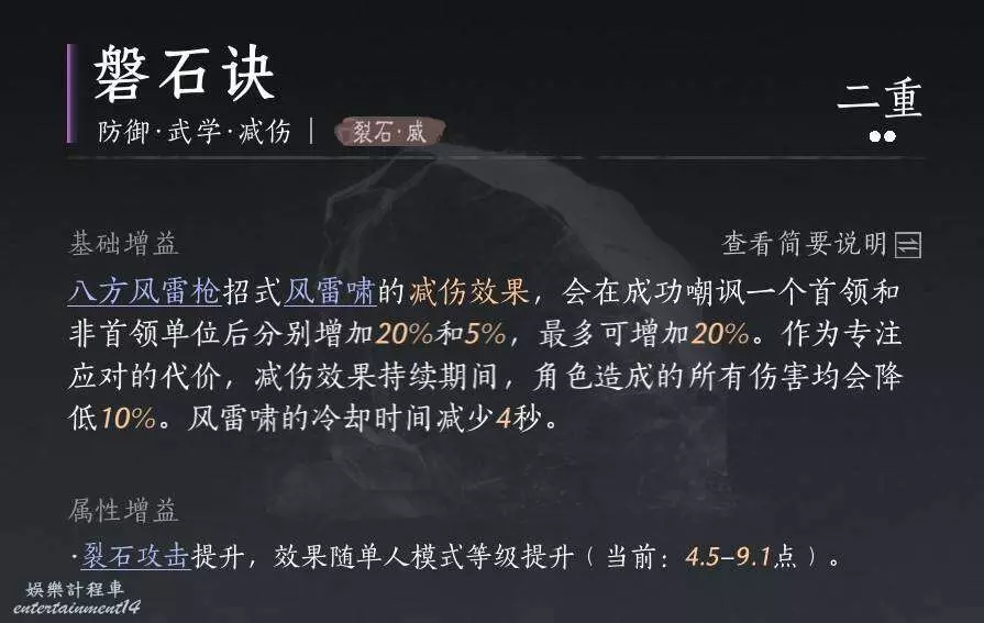 以八方槍的武學技風雷嘯為例,帶上磐石訣應該為20%減傷+磐石訣20%減傷(4重25%減傷)。請注意,風雷嘯的20%嘲諷“使Boss降低20%傷害”應該是乘法而非加法,為避免干擾,不考慮該詞條的減傷效果,後續相同