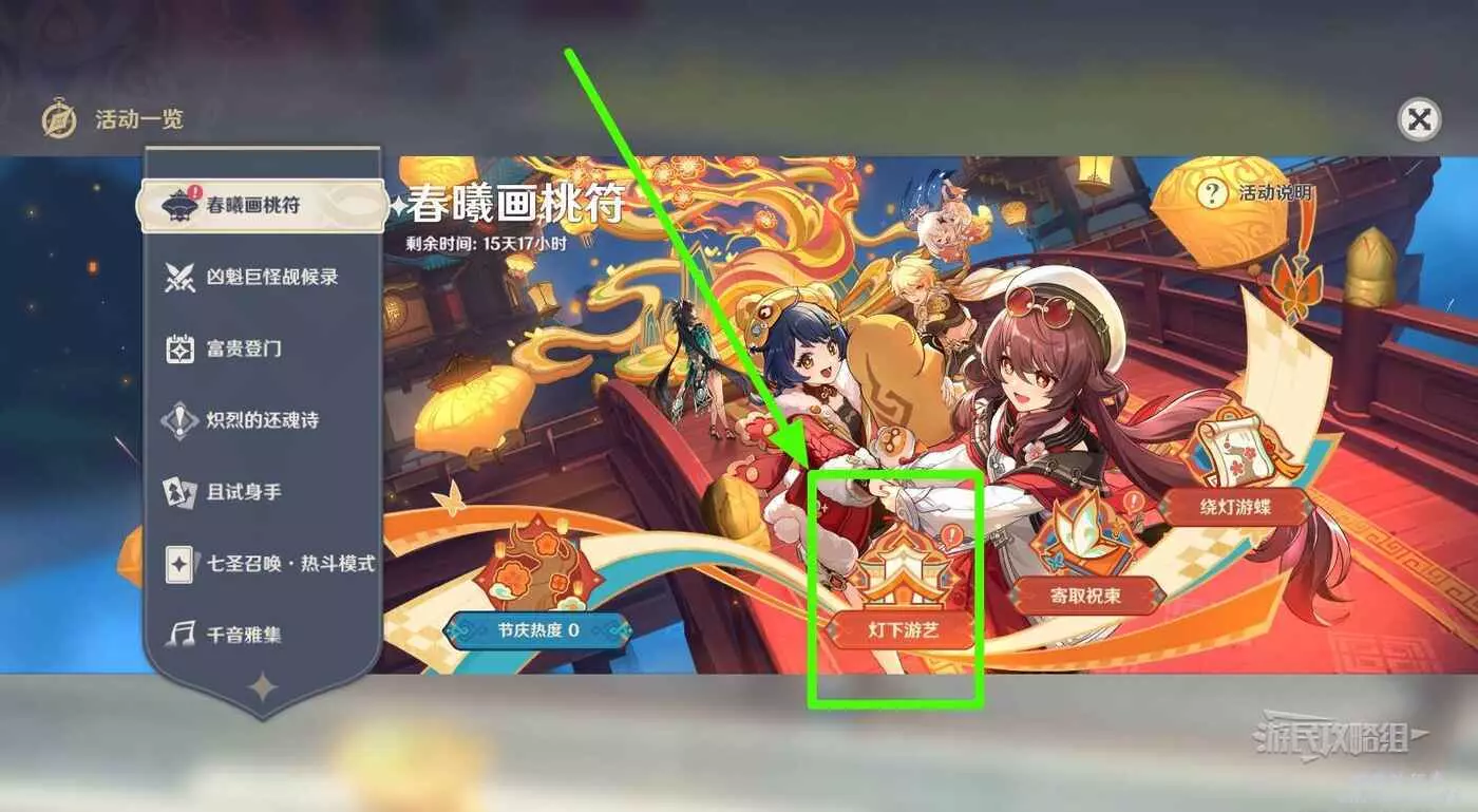 打開活動介面找到【春曦畫桃符】,點擊【燈下遊藝】。