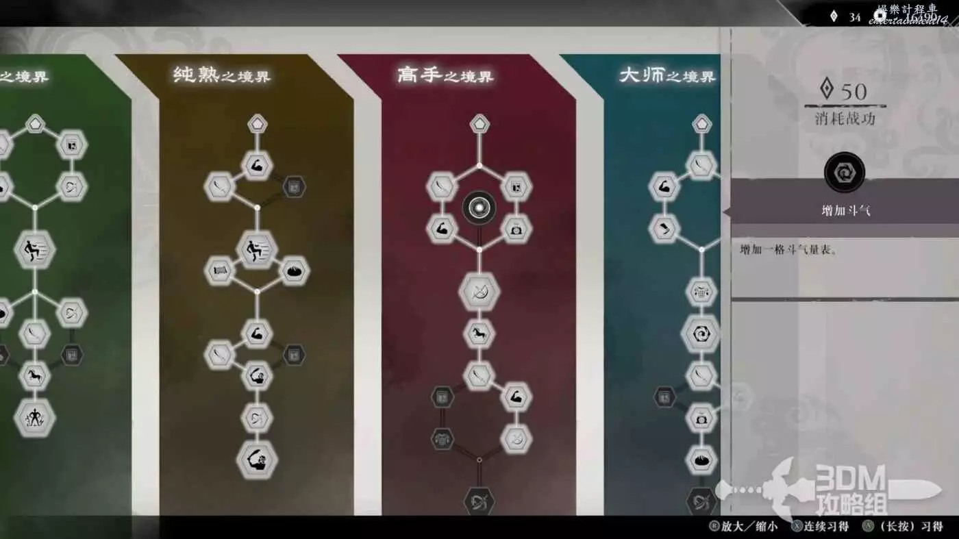 到達村子觸發劇情後,解鎖高手之境界的額外技能,可以消耗50點戰功,增加一格鬥氣表。