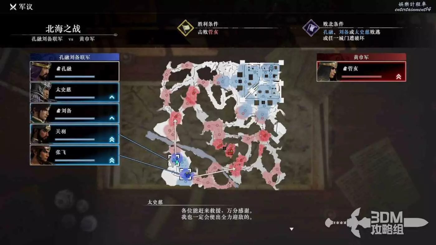 敗北條件:孔融、劉備或太史慈敗逃 或 任一城門遭破壞