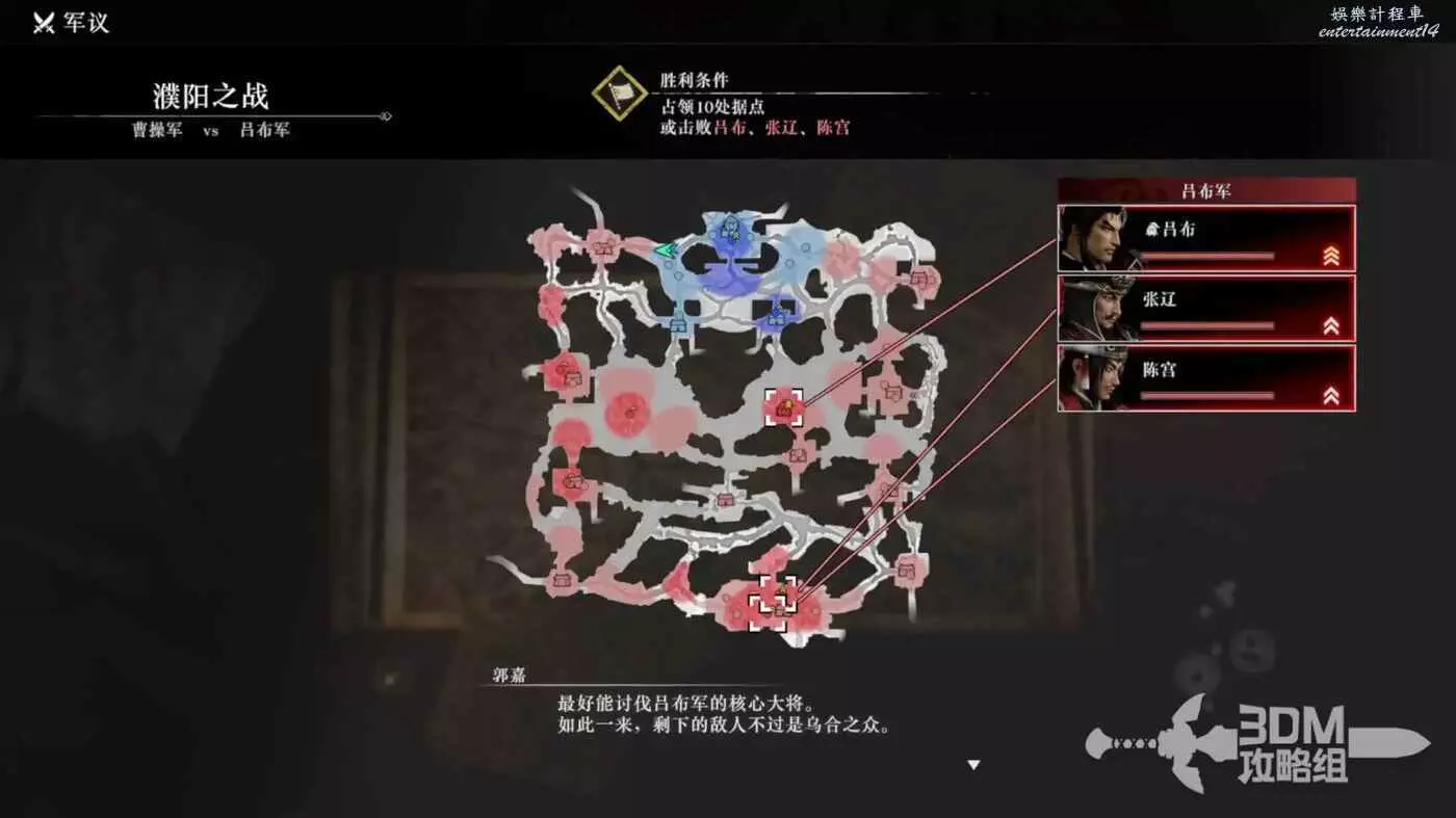 此戰我們和郭嘉從北側大本營向西邊進軍,躲開呂布的鋒芒,佔領據點。