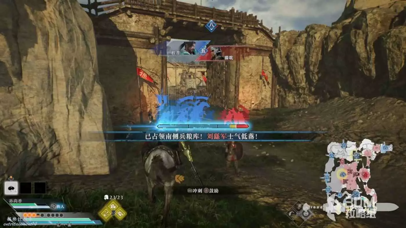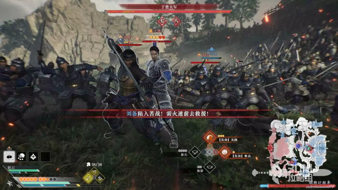 沒有據點可占,並且我方據點會被敵人佔據,所以士氣掉的很快,我方中間的劉備軍容易受到於禁部隊的突擊,需要及時支援。