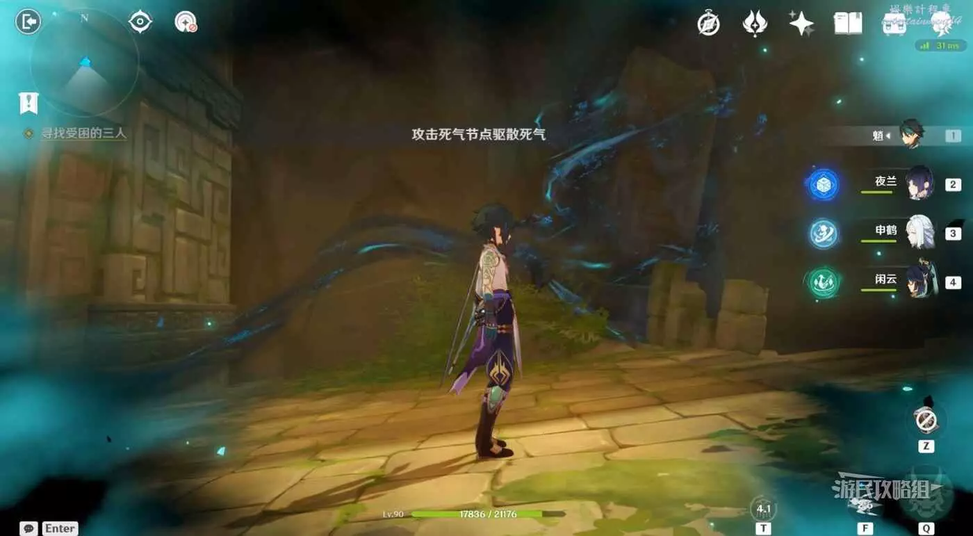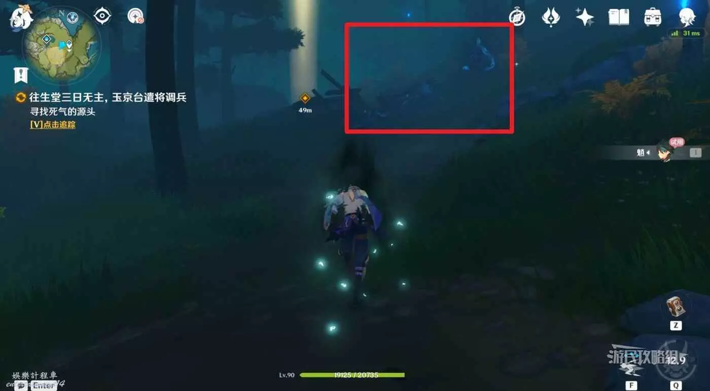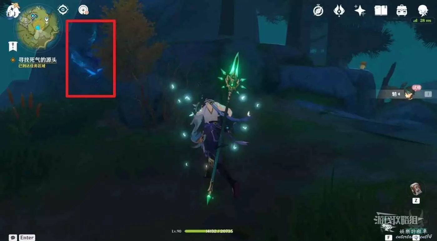 站在捕捉第二個小藤人的位置,按T切換視野往前方右側看可以看到一個石柱,石柱上有死氣團,靠近並打散。