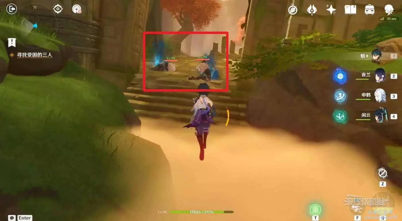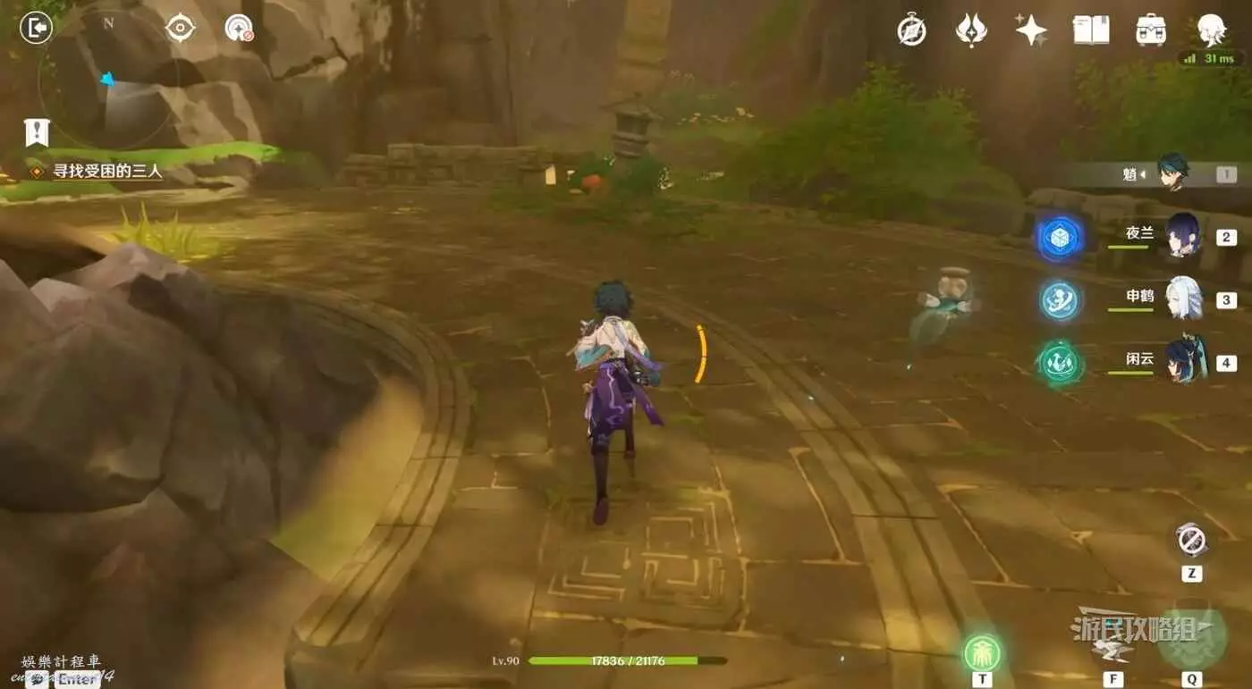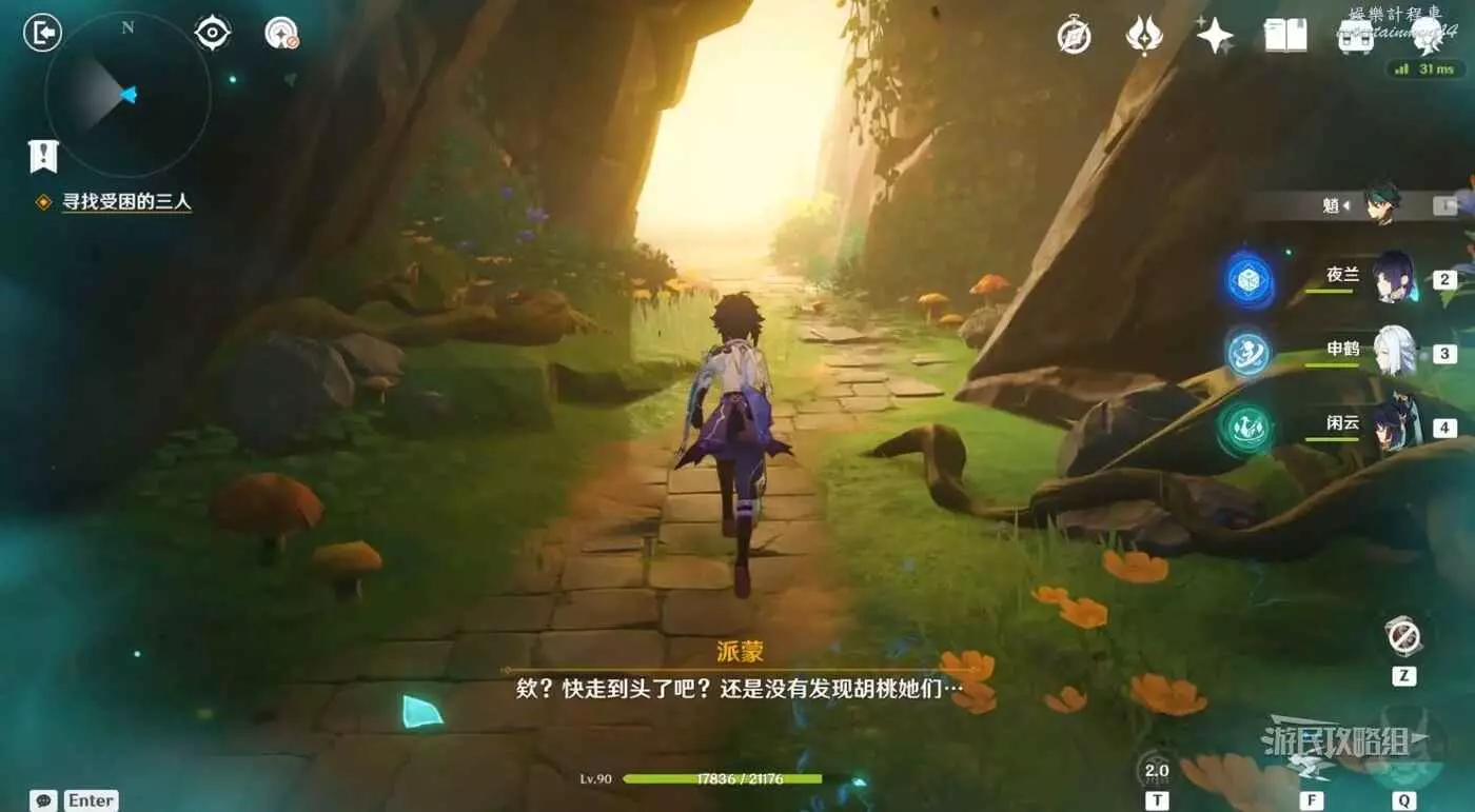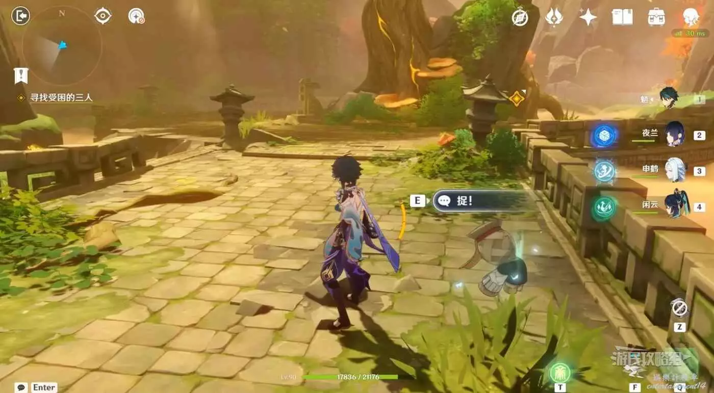 前方進入山洞秘境,進入山洞前會獲得與魈共用視野的能力,在山洞中按T即可使用。副本中需要多次擊敗丘丘人,記得提前調整好陣容。
