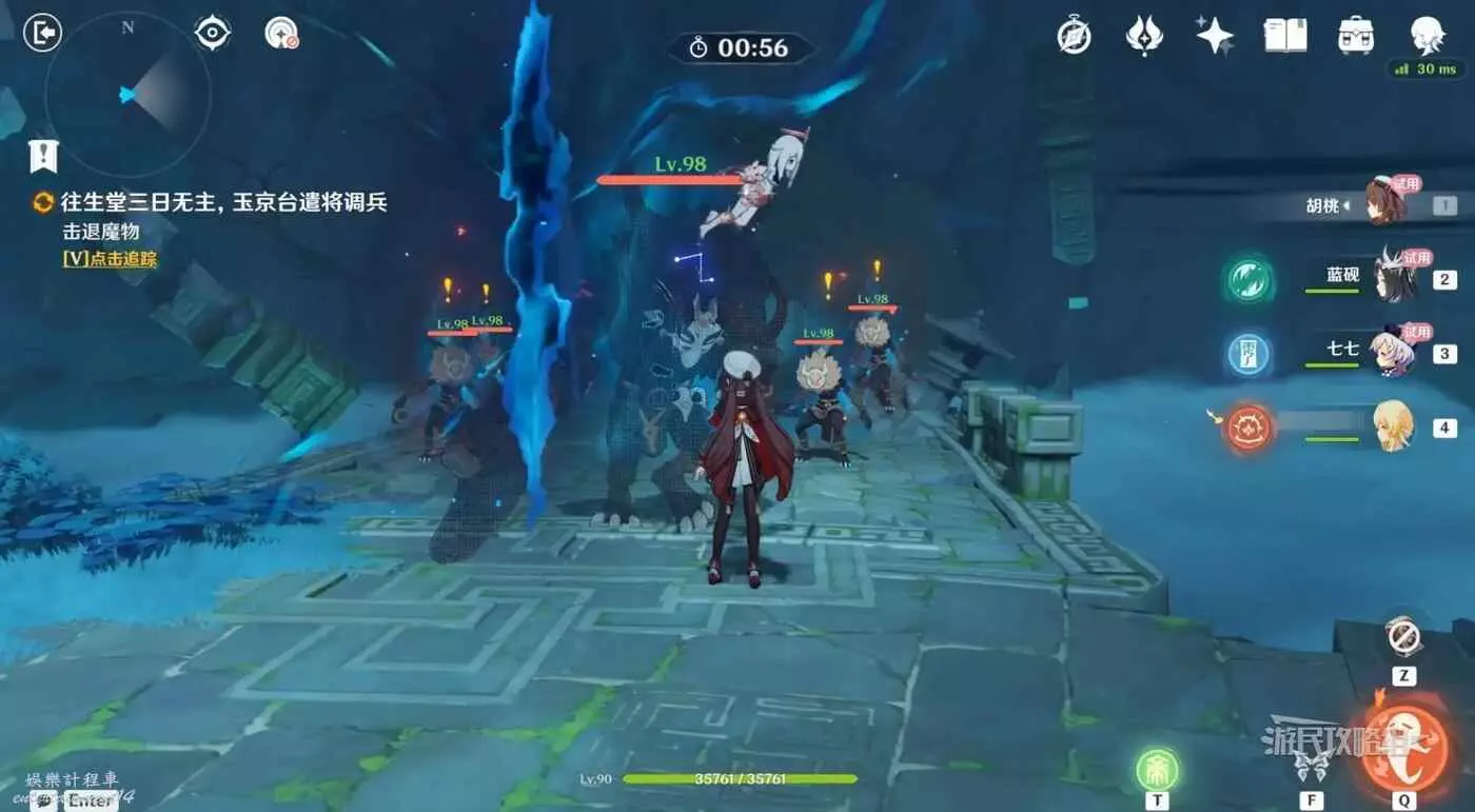 劇情結束後觸發與丘丘人的戰鬥,需要用試用的胡桃、藍硯和七七還有旅行者進行戰鬥。