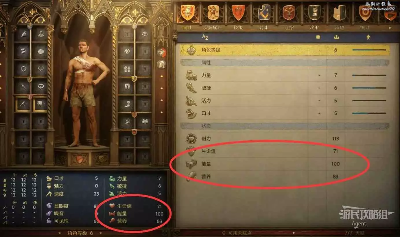 遊戲途中需隨時注意自己的生命值、能量、營養這三項屬性,困了需要找床睡覺恢復能量,餓了需要吃東西補充營養,在床上睡覺還可以順便療傷回血。你既不能睡太過也不要吃太飽,吃太飽會降低體力上限。