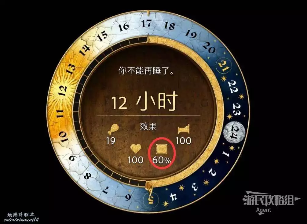 睡覺會推進時間,消除困倦恢復能量並療傷回血,同時食物消耗也會加快,睡醒後一般要吃點東西補充營養。除了生命值、能量、營養這三項屬性,下圖圈出的標誌是床鋪的舒適度。