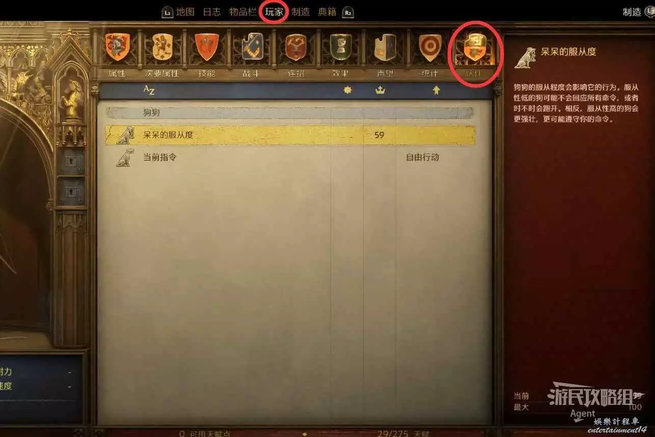 在“玩家-夥伴”一欄可查看狗狗的服從度。