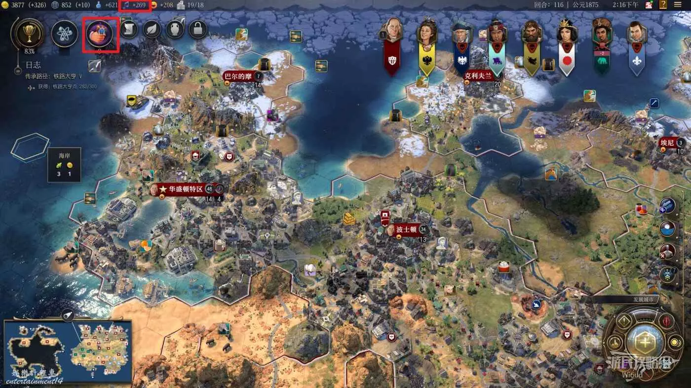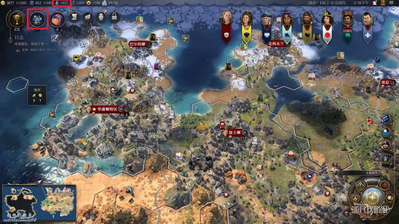 科技的增長也是通過各類增加科技值的建築增加,在外交方面通過研究合作也可以得到一些科技值幫助。