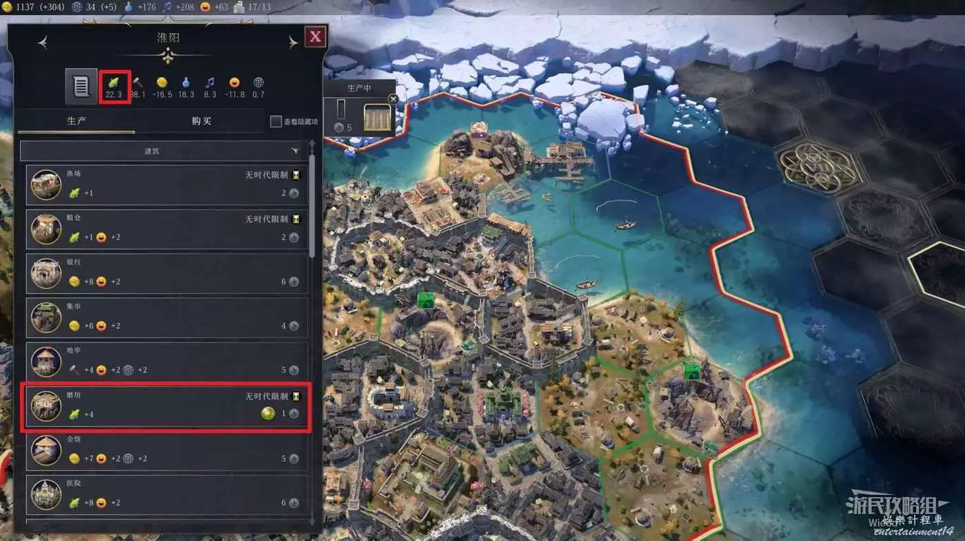 生產力主要影響城市生產某建築或單位所需的回合數,也是個人認為新手最需要注意的數值,每個城市的生產力數值單獨計算,首都的生產力高不會影響到周圍其他城市的生產速度;生產力主要通過地塊加成、生產力相關建築等因素增加。
