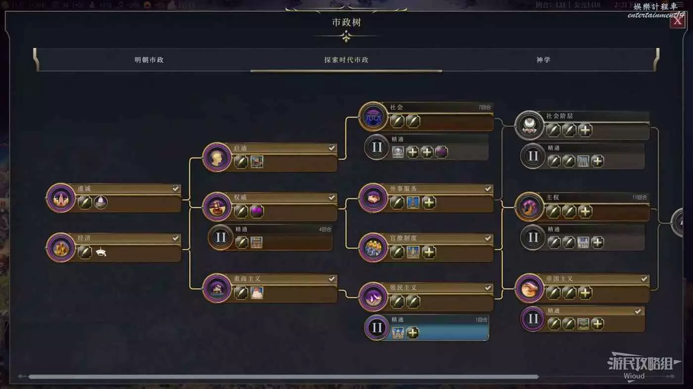 6代牢玩家需要注意的是,本代除了正常的市政,不同文明有不同文明獨特的市政樹,而神學也就是宗教也被單獨劃分了一條市政。