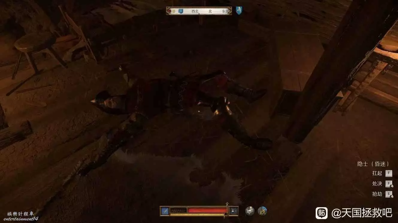 前面不說了,直接快進到騎士團來追捕冒牌隱士,先選擇幫助騎士團(加聲望)然後去和冒牌隱士談判,選擇問問發生什麼事(加聲望)最後選擇幫助隱士(加聲望),此時需要擊殺3名帶盾騎士團(可以在交戰中讓騎士團先擊殺冒牌隱士)結束後小屋前會有會有4具屍體可扒拉,門口還有一個先前被弩箭射倒的。