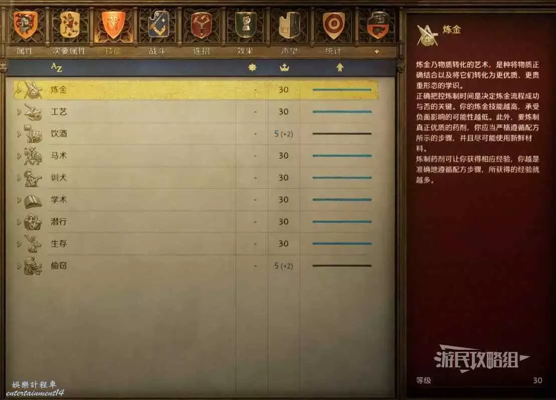 煉金:通過在煉金台煉製藥劑來提升等級。煉製藥劑的質量越好,獲得的經驗值就越多。配方可以通過藥劑師商店購買獲得。