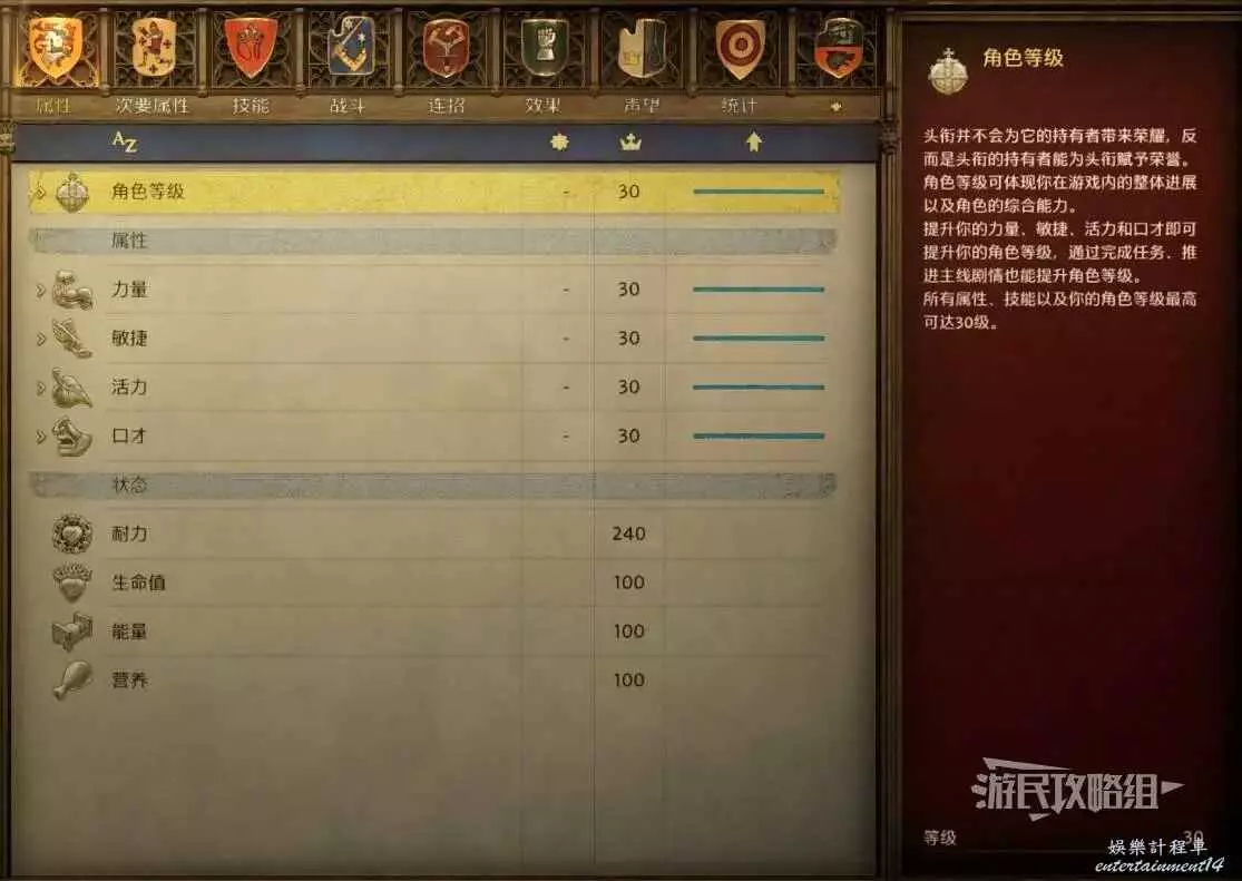 角色等級由所有主要屬性(力量、敏捷、活力、口才)的數值來決定,每提升一個屬性的數值就能獲得提升角色等級的經驗值。通過完成任務、推進主線劇情也可以提升角色等級。角色等級最高為30級(其他所有屬性和技能最高也是30級)。