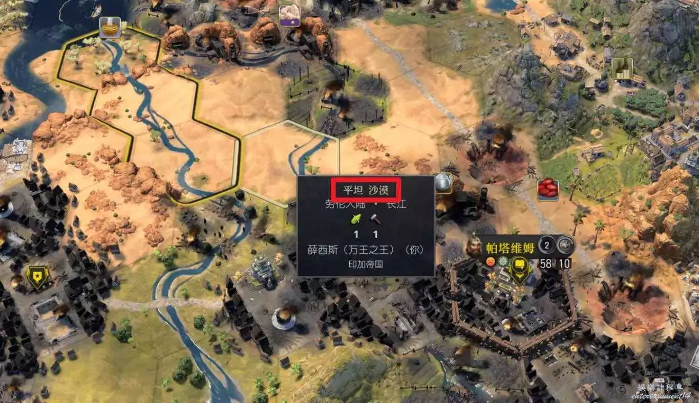 其次是地貌系統,地貌分為平坦、崎嶇、濕地與植被四種,生態系統和地貌會共同組合成一個完整的地塊,如下圖示例:生態群系為沙漠而地貌為平坦的格子。