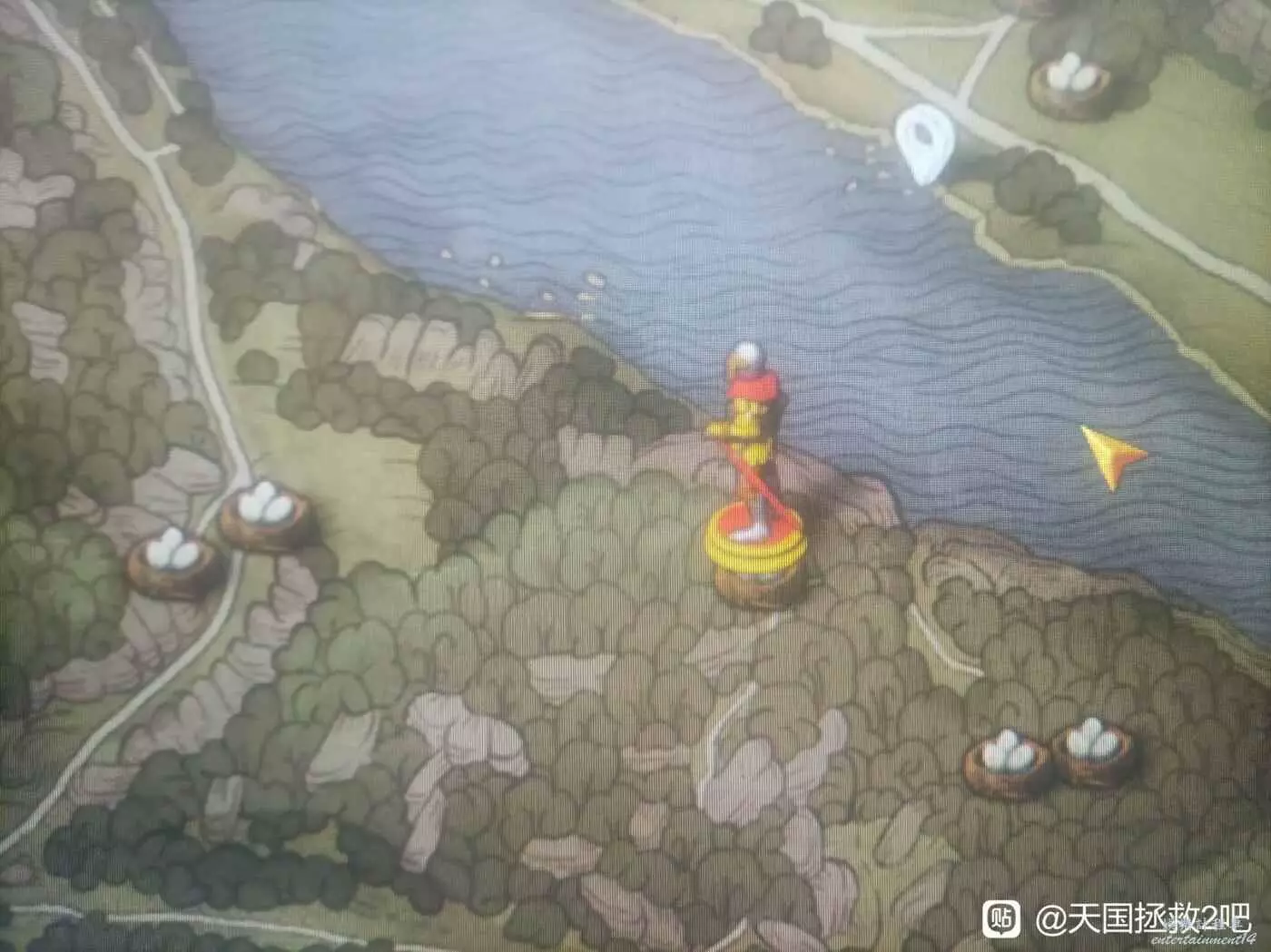先上山,找到這個大石頭,然後墓地位置就在這個大石頭往右邊(翻倒的馬車)這個方向的斜坡上,地圖的位置旁邊有個鳥窩這個地方,挖掘後就找到銀斧了。