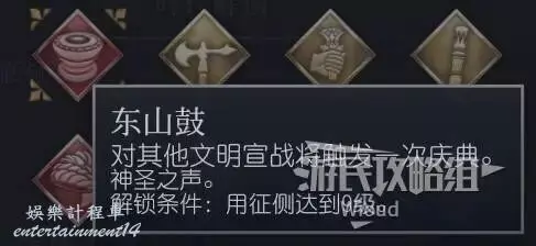 由於每當有慶典時,查理曼就能獲得免費的騎兵部隊,所以你會想要擁有東山鼓,這樣每次宣戰就能觸發慶典從而得到一支騎兵部隊。