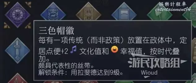 政府中每填入一項傳統(而非政策),首都每個時代可額外獲得 +2 文化值與 +2 滿意度。