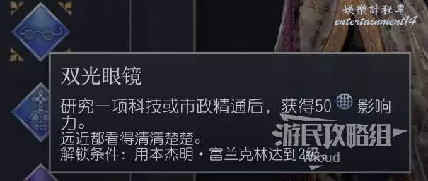研究一項科技或專精後,獲得50點影響力。在《文明7》中,研究科技是常規操作,而且有諸多理由花時間去精通它們。利用多餘的影響力,以各種方式譴責其他領袖。通過本傑明·佛蘭克林升至2級獲得。