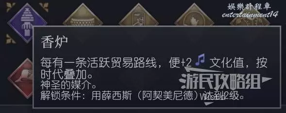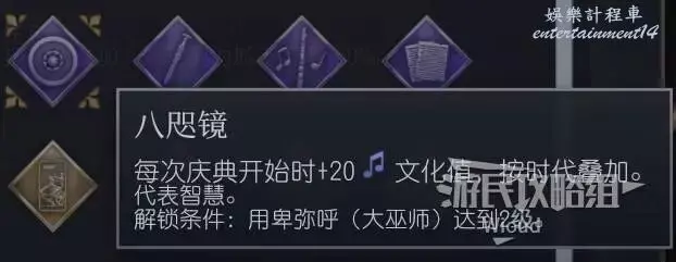每次慶典開始時,每個時代獲得20點文化值。謝天謝地,只要你的帝國沒有充斥著不滿情緒,慶典總會以這樣或那樣的方式舉行。通過“大巫女卑彌呼”升至2級獲得。
