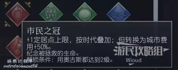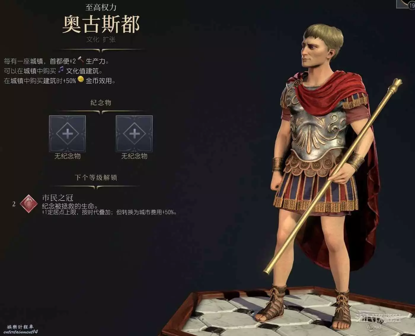 每個時代定居點上限 +1,但將城鎮升級為城市的花費比正常情況多50%。通過奧古斯都本人升至2級獲得。