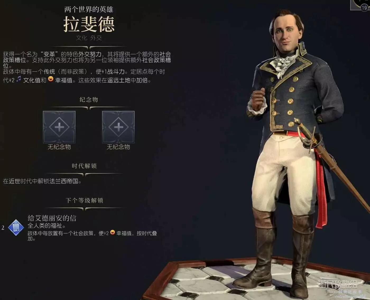 雖然拉法耶特並非軍事型領袖,但政府每採用一項傳統,他仍能使部隊獲得 +1 的戰鬥強度。