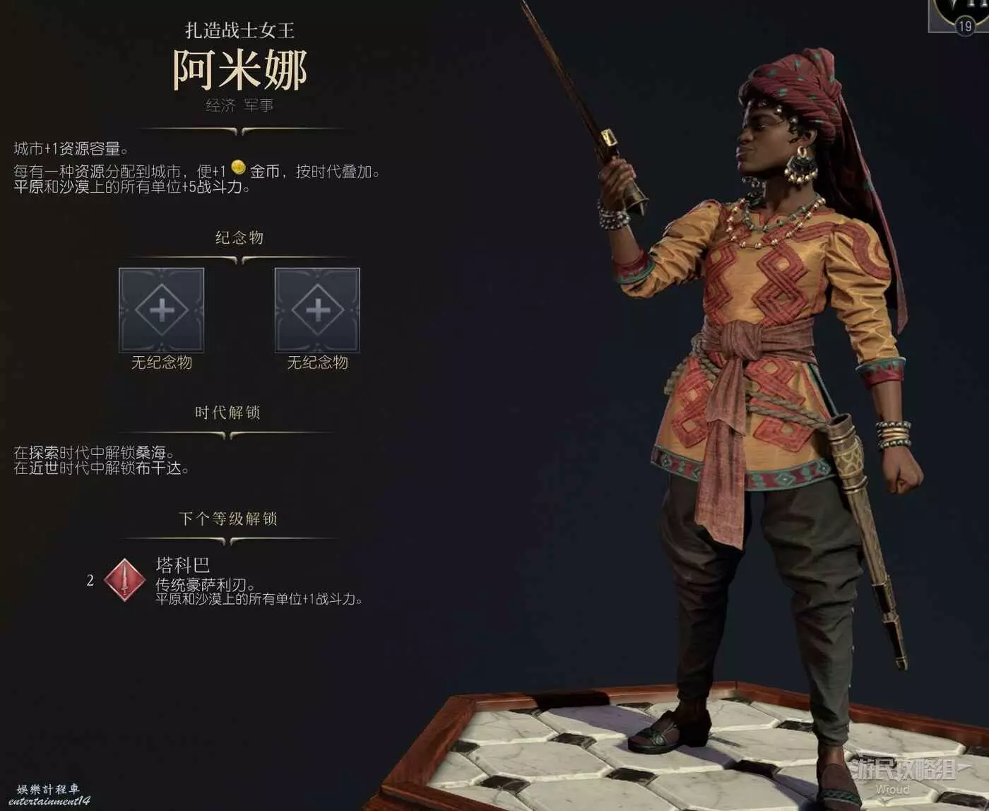 經濟與軍事並重 阿米娜專注於事務與戰爭。她完全有能力在摧毀敵對文明的同時實現可觀盈利,遊戲中每個軍事單位在平原和沙漠地格都能獲得 +5 的戰鬥強度加成。