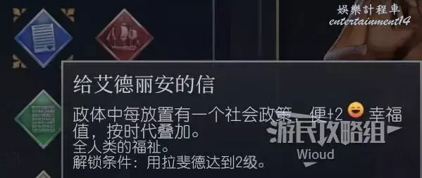 每個社會政策槽位,每個時代獲得 +2滿意度。社會政策槽位元數量在每個時代都會重置,所以你需要時間,才能在三個時代都真正收穫其帶來的回報。不過,這仍是相當不錯的提升。通過拉法耶特升至2級獲得。