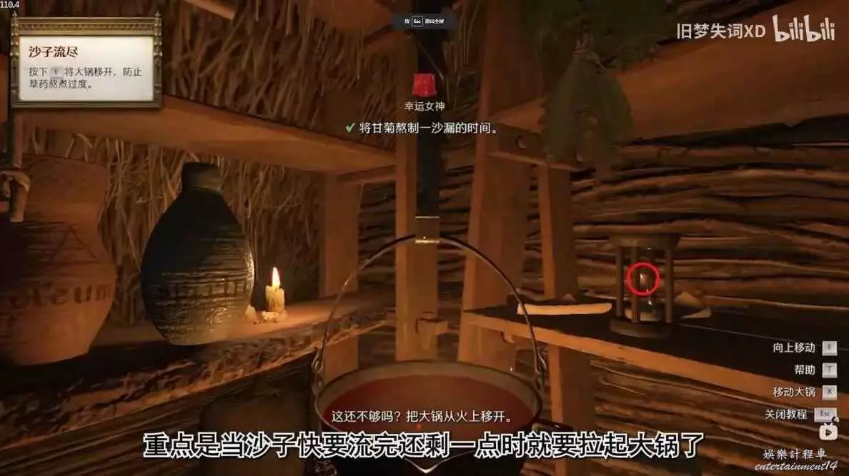 在加入葡萄酒和擺好原料後,下拉大鍋,再翻轉沙漏,可以發現我們翻轉之後原料才有沸騰的動畫,所以這裡不需要太糾結,重點是當沙子快要流完,還剩一點時就要拉起大鍋了,老太太會提示你的,如果慢了一拍,那麼熬制出來的就不是特效甘菊,而是普通甘菊,不過不管是特效還是普通,都會提高聲望。