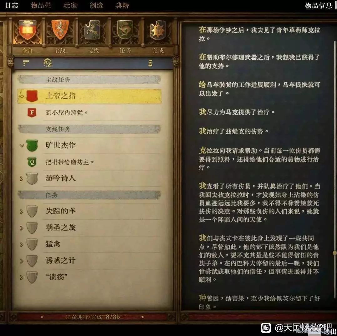 首先到囚牢門前觸發劇情,需要口才和魅力也可以恐嚇(掉聲望),中等嘴炮難度,和被俘貴族談話不過需要撒謊。然後找克拉拉觸發任務。克拉拉的小屋有醫療用品。爬樓梯上去把箱子裡的東西全拿上。