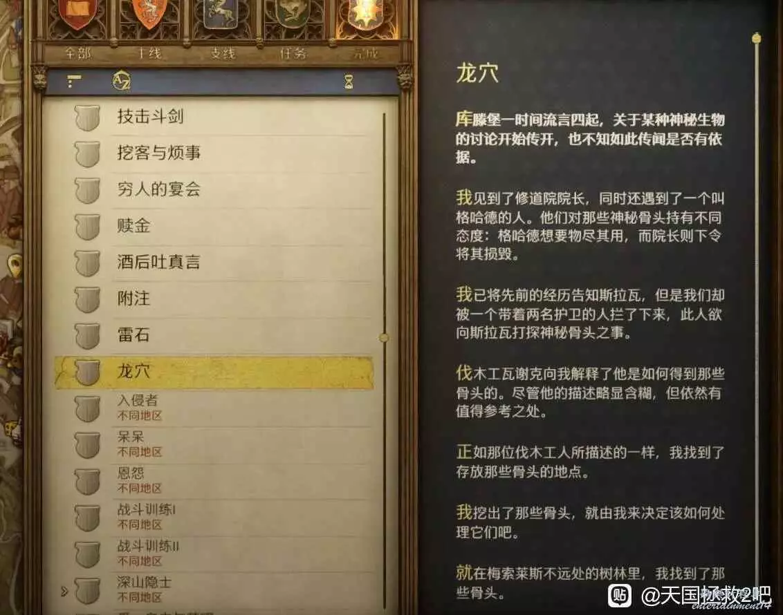 任務名叫龍穴,接到此任務後會先和一位修道院長搭話,他會要求你找到並銷毀傳得沸沸揚揚的“龍骨”(根據後來的百科描述這大幾率只是一種史前生物的殘骸