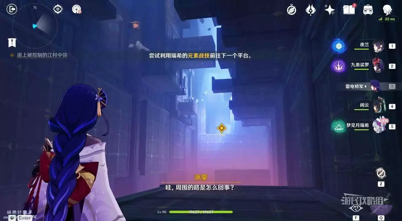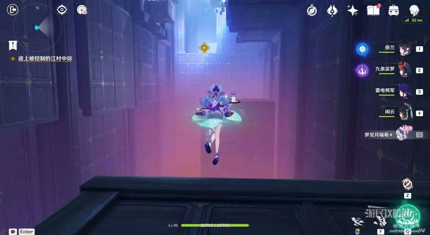 前方會進入一個跳躍通道,可以使用夢見月瑞希的戰技飛過鏤空的地方,到達前方平台。夢見月瑞希的戰技可以浮空,浮空後再次點按戰技即可落地。