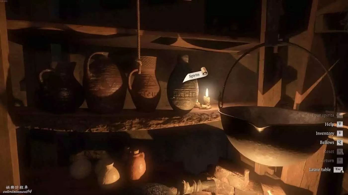本作的煉金成品收尾方式共三種,一是普通的裝入藥瓶,按E拿起藥瓶對鍋長按E;二是蒸餾,按E拿起藥瓶對蒸餾瓶長按E,常用於烈酒為基底的藥劑;三是入研缽研磨,對研缽長按E,只用於兩種火藥。